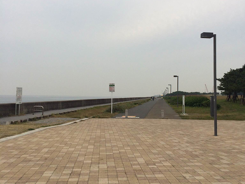 こちらには自動車は入ってこられません。自転車と歩行者はこのような感じで分けられているので、walk and runの方は左側を進みましょう。写真はロータリーを起点として、千葉方面へ向かうコースです。右手に海を見、潮風を感じながら、広い空の下を走るのは非常に快適です。