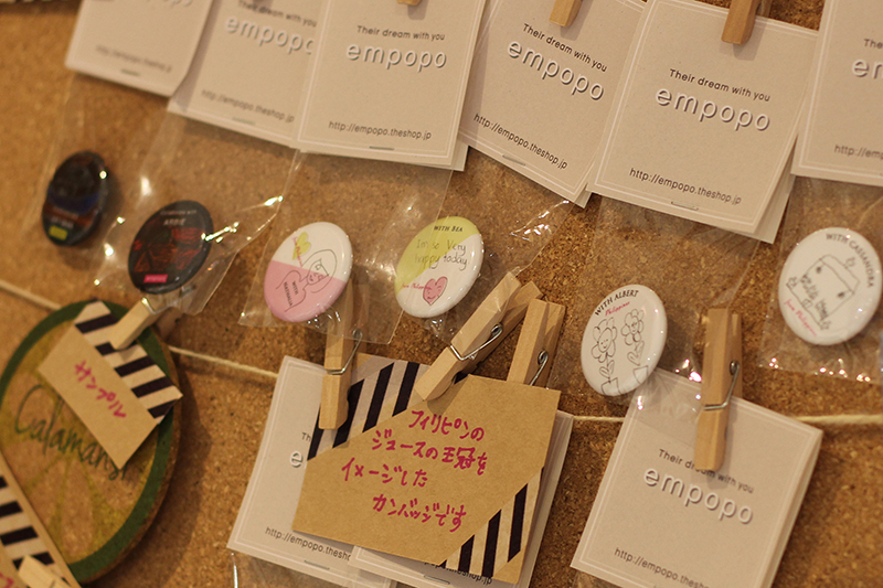 今までにも展示スペースでは美大生の作品展や本の原画展などが行われています。中でも、与那国島の雑貨屋さんが出展したときにはかなり好評だったとか。今回行っているフィリピンの雑貨も、バッジやコースターなどを買われていくお客様が多いそうです。