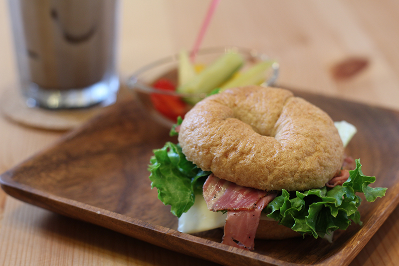 フィットネススタジオで運動した後にちょっと飲めるものを…と始まったカフェ、最初はスムージーのみの販売だったそうですが、徐々にメニューが増え、お客様のリクエストもあって今ではパスタも食べられます。今回は一番人気!というおからベーグルサンドセットをオーダーしました。