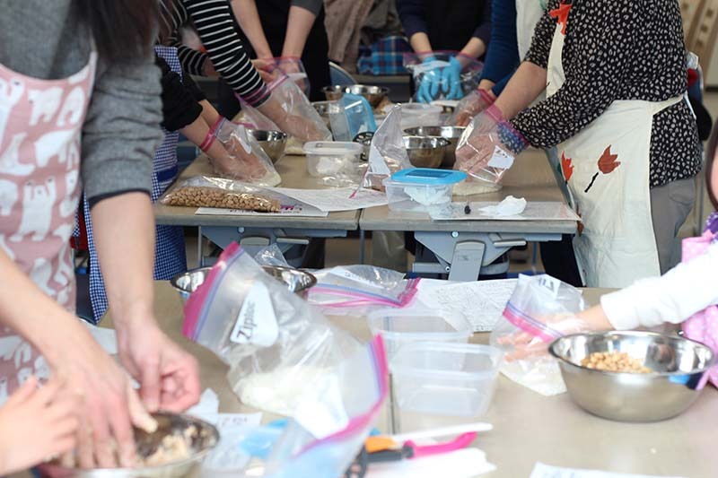 親子連れ、赤ちゃん連れ、若いご夫婦、お友達同士…など、様々な年代の方々が集まり、講師であるIBA旬彩Cookingの四十栄(よとえ)先生からの説明を受けます。