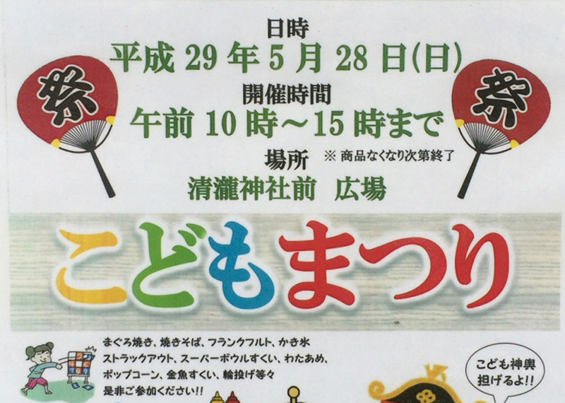 こちらは境川テラスほど大規模なイベントではありませんが、清龍神社で子ども向けに開催されるお祭りです。まぐろ焼き、焼きそば、かき氷、わたあめ等々、お祭りの定番屋台や景品付きのゲームや金魚すくなどが出店予定です。こども神輿も担げる予定! こちらは、5月28日(日)10時~15時開催予定です。ご近所で小さなお子さんがいらっしゃる方は、是非足を運んでみられては。
