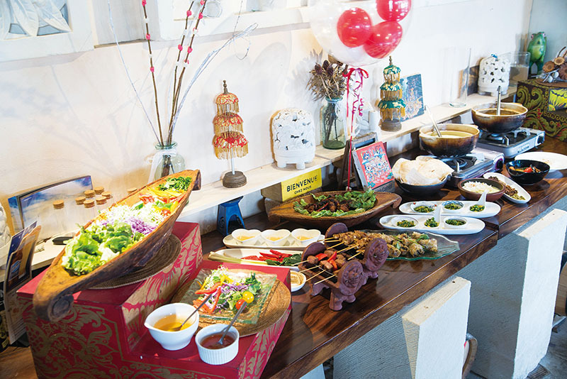 「そんな空間をもっと多くの方に楽しんで欲しい。特に『夜はなかなかお出かけが出来ない』という女性に向けて、昼の時間でも空間を楽しんでもらえるよう、この春からブッフェも選べる『スプリングランチ』をスタートすることにしました!」浦安に根ざしたエスニック料理でありたいと、PJではバリ料理を中心にタイ料理、ベトナム料理、シンガポール料理、インド料理と、アジア各国で慣れ親しまれた日常的定番メニューを、本場の味に忠実に現地料理人とのコラボでメニューを開発しています。バリの屋台で定番のサテアヤム(焼き鳥) には今回、贅沢に牛串焼きもプラス。また、ベトナム料理からは爽やかな揚げ春巻きが登場。これがサクッと軽くて絶品! ヤムウンセンの爽やかなの酸味のタレでいただきます。