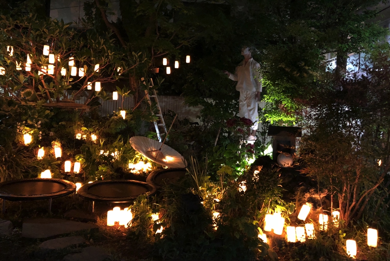 路風舎には何度かお邪魔したことがあるのですが、このように光がいっぱいに溢れる夜のお庭を拝見したのは初めて。100個の灯はタチアキヒロさんが舞台セットとして設置したものだそうです。