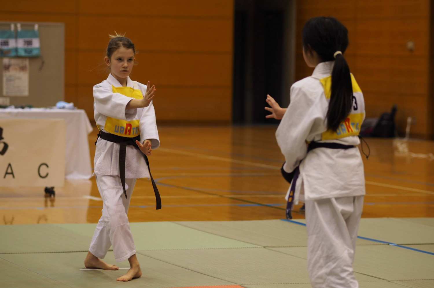 護身術とも呼ばれる合気道。攻撃するのではなく「相手が来た時にどう対応するか」を学ぶ柔術のため、合気道の大会では柔道や剣道のような所謂『試合』の形はとりません。子ども達は日々の稽古で学んだ合気道の『型』を披露し、その演武の正確さ・綺麗さを競います。