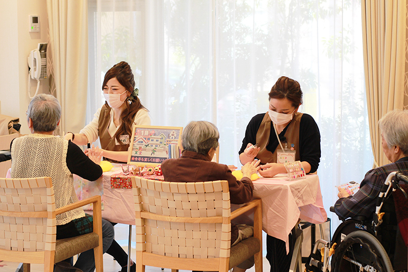 取材に協力してくれたのが東葛西にある「チャーム東葛西」の入居者様。この日は約10 名の予約があり、朝10 時から始まった訪問ネイルは途切れることなく、笑い声がフロアに響いていました。施術が終わると皆さん笑顔!「キレイにしてもらえると気分が全く違うわよ!」と満面の笑みで話します。