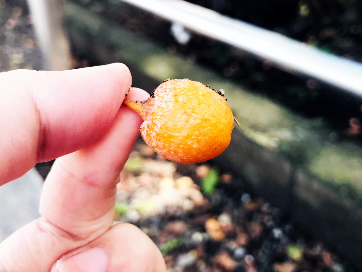 割れていないぎんなんの実はこんな感じ。(軸の部分を持てばニオイも手につきません。)スーパーで売っている馴染みのあるぎんなんは実は種なのです。オレンジ色の実を取り、種を乾燥させることで、あの姿になるのです。