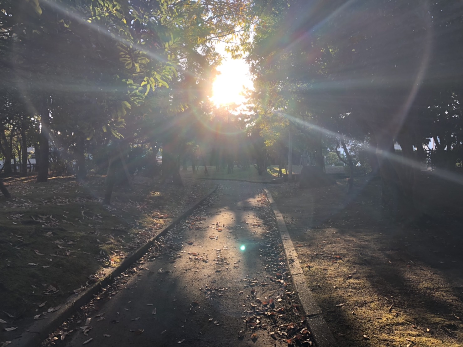 公園の奥には黄色く輝くイチョウの木がありました。夕日に照らされて、より存在感を放っています。