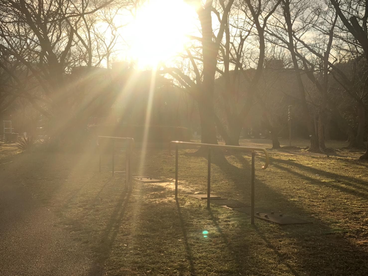 木々の間にはユニークな遊具がいくつも点在しています。これはベンチプレスか何かでしょうか…。それとも鉄棒…?