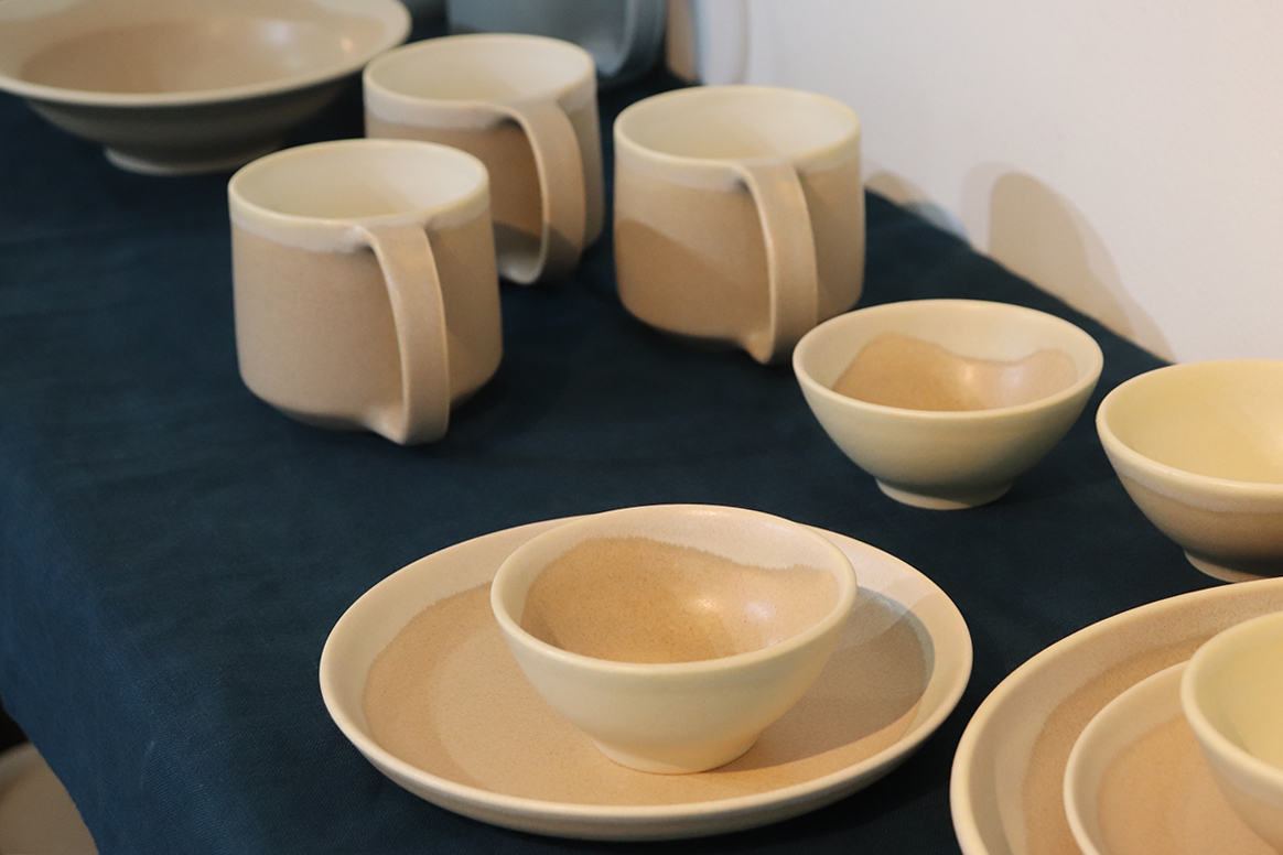 「青やグレーといった寒色系で静謐な雰囲気のうつわを作ってきたんですが、今年はちょっとベージュ系の色に魅かれて。『柔』な色味のうつわを作りました」とすなおさん。今年の新作は温かみのあるベージュと乳白色、そして2色の間の滲みが特徴です。