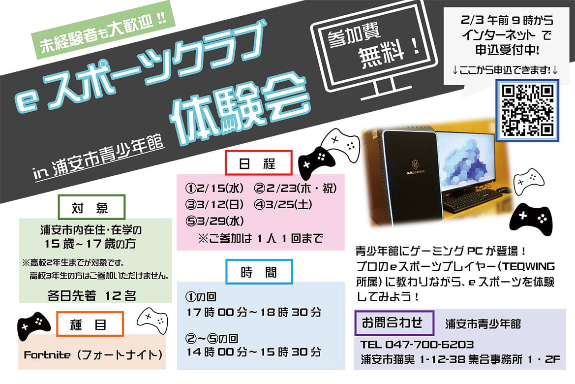 青少年館にゲーミングPCが登場! 青少年館ではこれまでもeスポーツ体験が小学生を主に開催されていましたが、今回は、浦安市内在住・在学の15歳~17歳、中学3年生から高校2年生までの青少年を対象に、eスポーツ専用のパソコンを使って、プロのeスポーツプレイヤーに教わりながら、eスポーツを体験することができます! 参加はもちろん無料で、ゲームの種目はフォートナイトで実施されます。