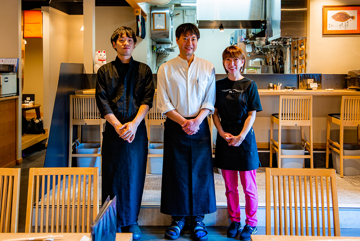 真っ白な暖簾をくぐると、そこに広がるのはさっぱりと清潔ながら温もりを感じる空間。テーブル席、カウンター席、個室があるので、人数やTPOに応じた使い方が可能です。カウンターの向こうでは店主の岩垂さんが腕をふるい、明るく元気なおかみさんがホールを切り盛りします。6歳になるお嬢さんも、看板娘としてお店を手伝うこともあるのだそう。現在スタッフ募集中とのこと、気になる方はぜひチェックしてみて!