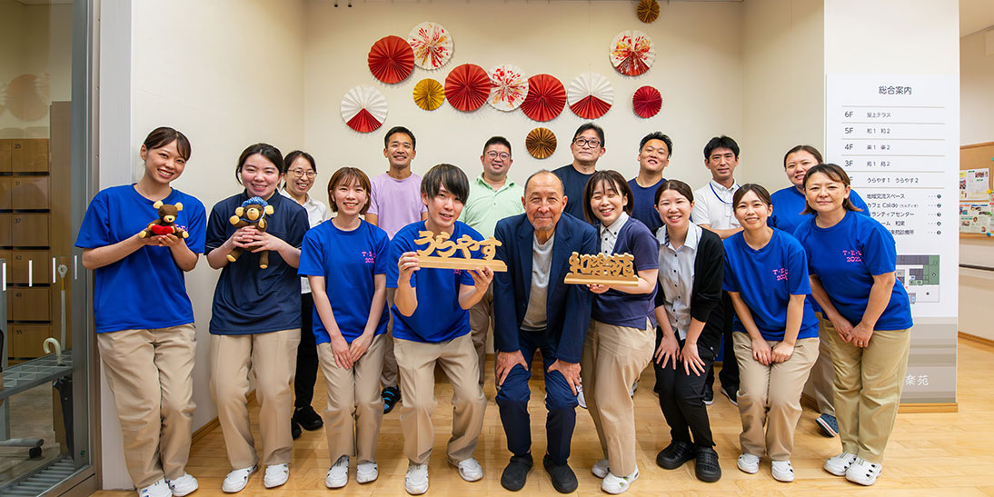 2015年4月、浦安市有地の無償提供による恩恵の下に、個室ユニット型と従来型を併合した特別養護老人ホーム「うらやす和楽苑」が開設されました。同年9月には認知症対応型通所介護事業を開始。さらに2017年7月には居宅介護支援事業所を併設するなど、地域の方々と共に歩み続けているとお話しいただいたのが、社会福祉法人 東京栄和会理事長、うらやす和楽苑 苑長の鈴木信男さん(写真真中)です。