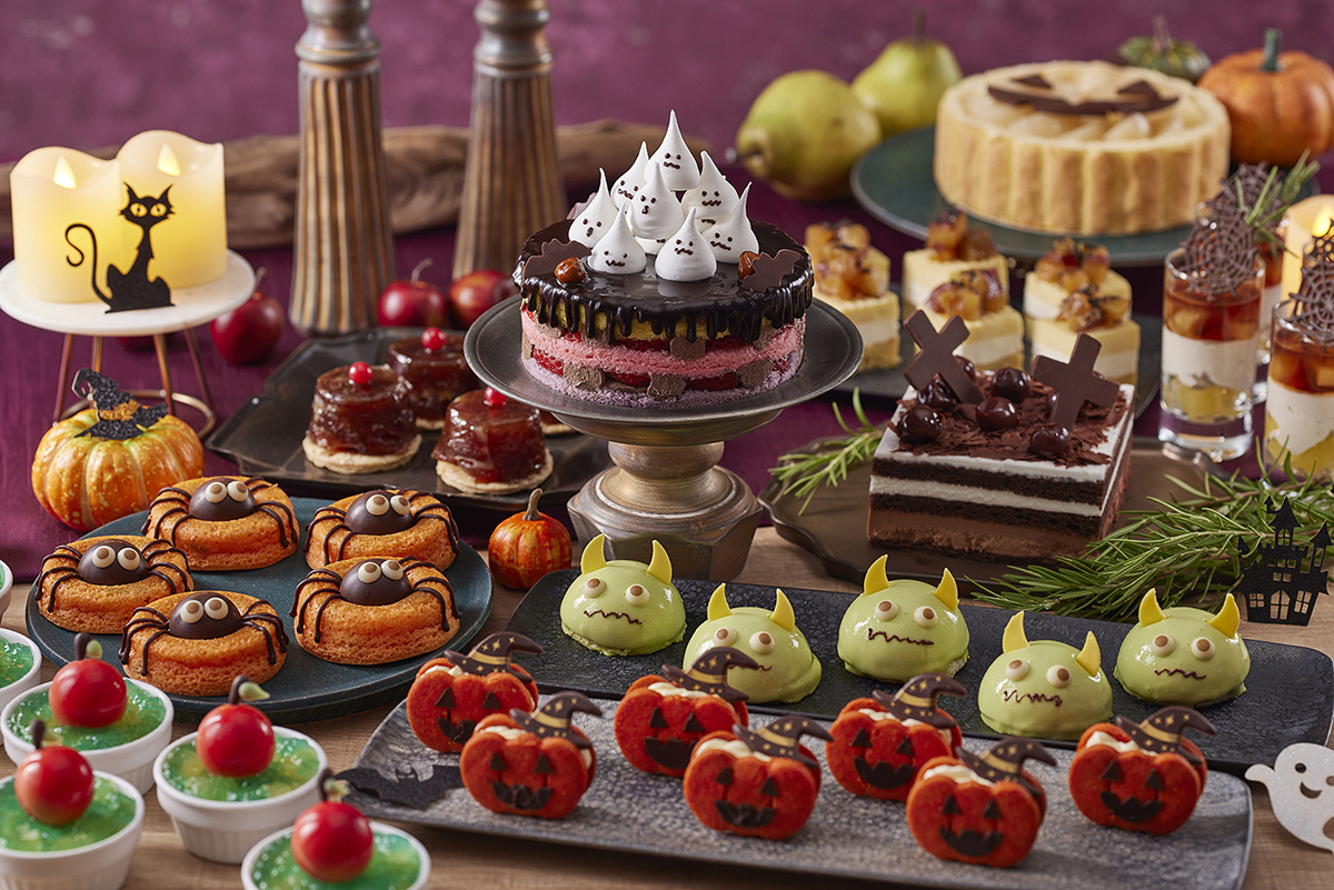 ブッフェテーブルには、身を寄せ合うメレンゲおばけたちがキュートな「ハロウィーンネイキッドチョコレートケーキ」や、キャラメルムースを覆うブルーグリーンのジュレとリンゴチョコが魅惑的な「魔女のリンゴケーキ」、魔法使いに扮したジャック・オー・ランタンが笑いかける「カボチャキャラメルバターサンド」など、約25種類の妖しくも可愛いスイーツが勢ぞろい。まるでスイーツたちがハロウィーンを楽しんでいるみたい!
