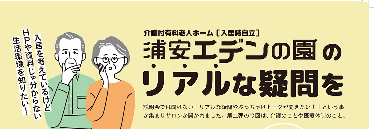説明会では聞けない!リアルな疑問やぶっちゃけトークが聞きたい!!という事で、先日「浦安エデンの園」のスタッフさんと姉妹冊子「ゆうゆう手帖」の読者さんが集まりサロンが開かれました。第二弾の今回は、介護のことや医療体制のこと、看取り期についての多かった質問を、まとめました。
