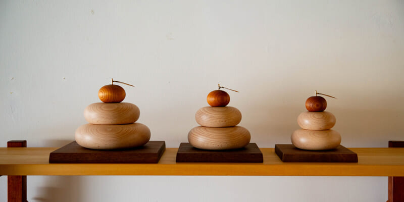 「Okalu」の代表作のひとつ「木の鏡餅」。「同じ木でも木目や節の出方でまったく違う表情を見せる。