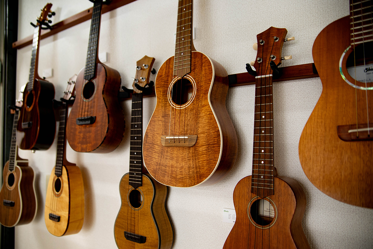 妹さんがハワイで買った一本のウクレレを見て、「作ってみたい!」と思ったのが製作のきっかけ。外国の本を頼りに独学で挑戦し、3か月かけて完成させたのが最初の1本でした。「“いいじゃん、鳴ってるじゃん”って言われて、それだけでうれしくて」と笑います。その後、本格的に本場ハワイの工房にも通い作品作りを始めます。「厚みが0.2ミリ違うだけで音が変わる。でもそれが面白いんです」。一本一本に手の温度が宿るそのウクレレは、木の命を奏でるような温かな響き。作品はOkaluさんの Okalu公式HP でもご覧いただけます。