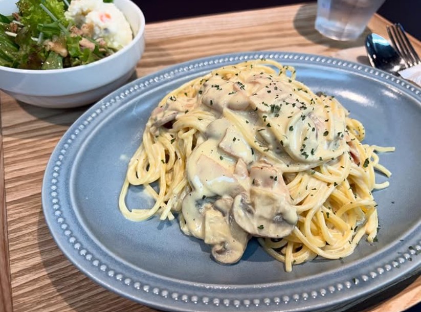 窓から差し込む光がやさしく、ゆったりとした時間を演出してくれます。テーブル配置も広めで、ベビーカーのままでも安心。懐かしい洋楽のBGMが流れ、まるで海外の小さなカフェのよう。