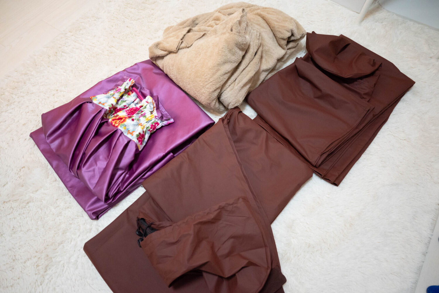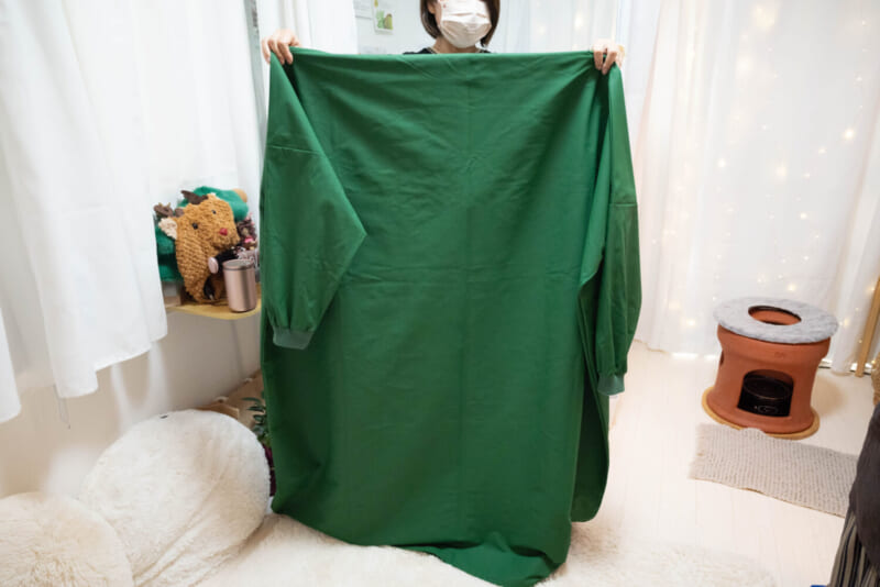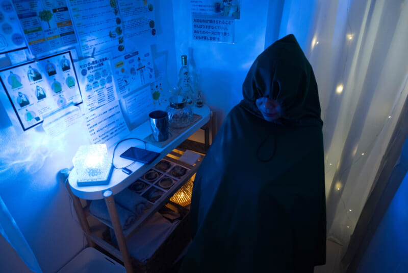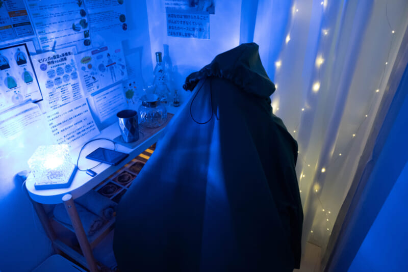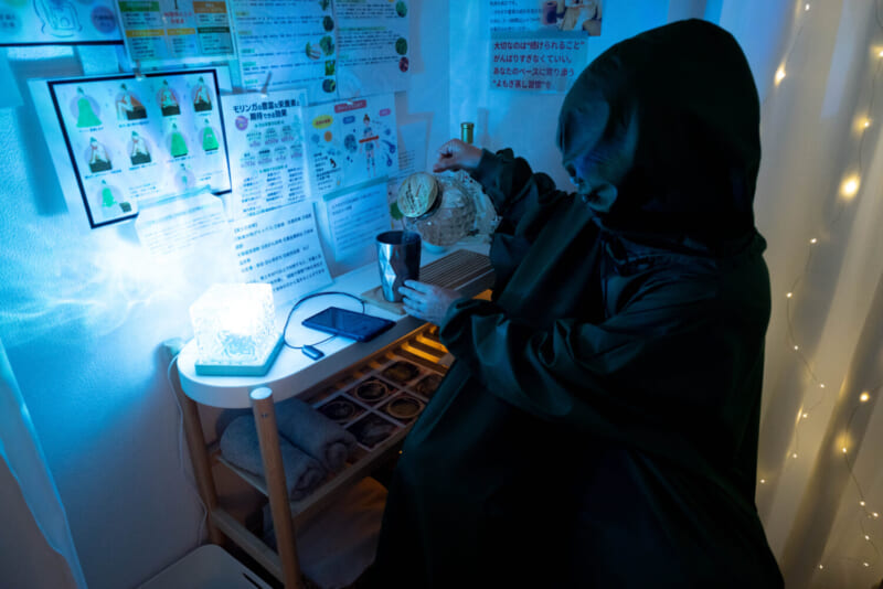座り方には色々なスタイルがあるようで、あぐらや体育座りなど姿勢を変え、自分の身体にちょうど良い当たり具合や熱加減を探していきます。マントをすっぽりかぶると顔まで蒸気が当たるので、このスタイルがお気に入り♪