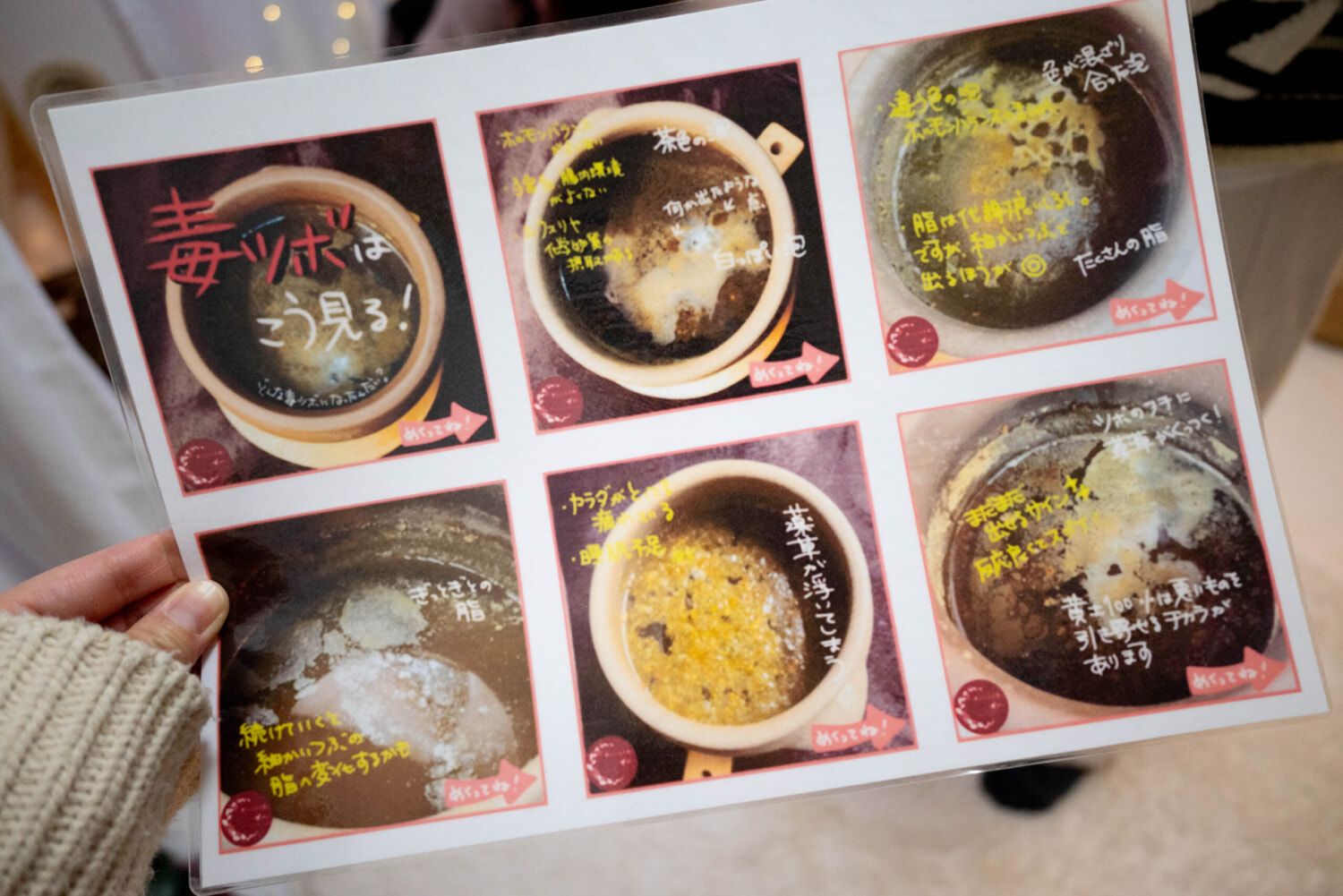私の壺の中はというと――、泡がふわっと浮いていて、薬草が縁にペタッと付いていました。スタッフさんによると、泡は「ホルモンバランスのゆらぎ」、薬草が縁に付くのは「しっかりデトックスしたサイン」なんだそう。さらに皮脂のような油分も少し浮いていて、「今日は睡眠不足だったり、生理前だったりするとこういう風になりやすいんですよ」という話にも深く納得。