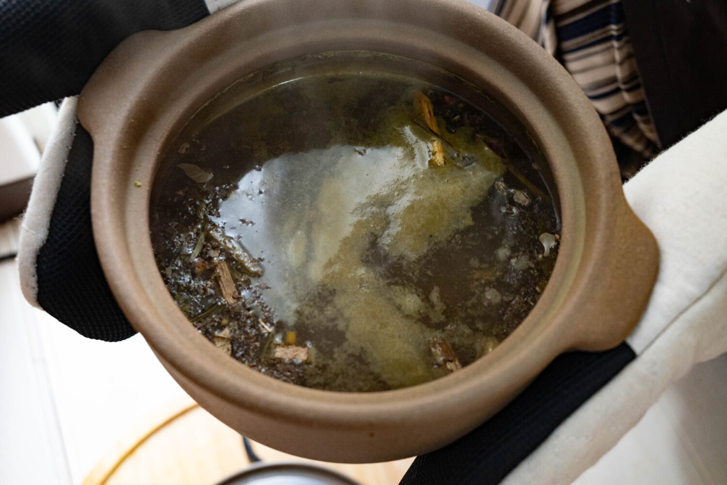 「よもぎ蒸し」後の壺の中――じつは、その人の体から出るサインなんだそう! 他の方の写真を見てみると、脂がたまっていたり、薬草が浮いていたり…。