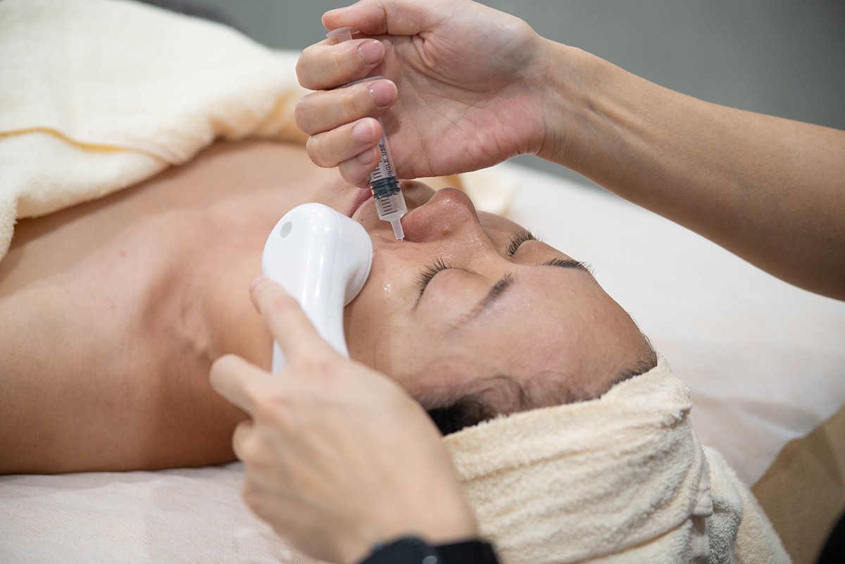 ハイドラ後はヒト乳歯幹細胞を導入。イオン導入の20倍の成分浸透率があると言われている、エレクトロポレーションを併用し、肌の奥へ奥へと入れていきます。