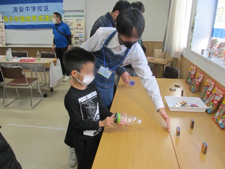 たくさんの成果発表や体験会がある中、子どもたちの楽しそうな笑い声で賑わっていたのは【浦安中学校区青少年健全育成連絡会】浦安中学校自然科学部の生徒たちと一緒に行った科学工作のコーナー。