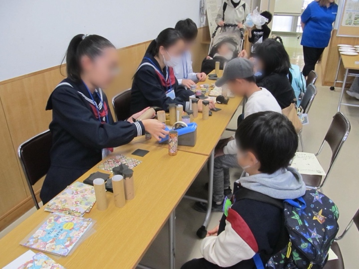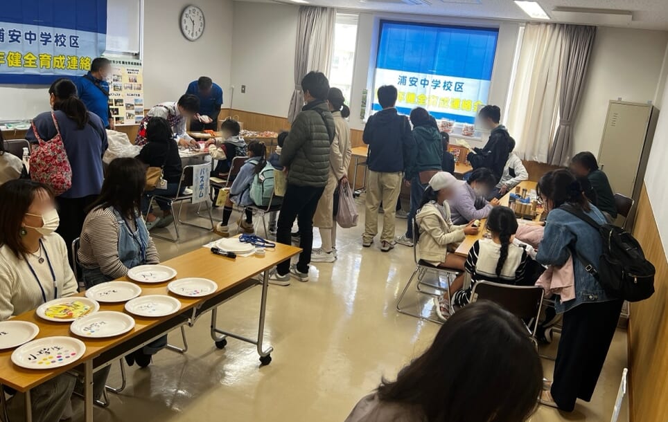 浦中学区健育では、毎年校区内にある中央公民館と当代島公民館の地域交流会に参加しているのだとか。「今年は浦中自然科学部の部員と科学工作の体験コーナーを開きましたが、昨年度は浦中美術部とワークショップをやったんですよ」と西脇さんが教えてくださいました。
