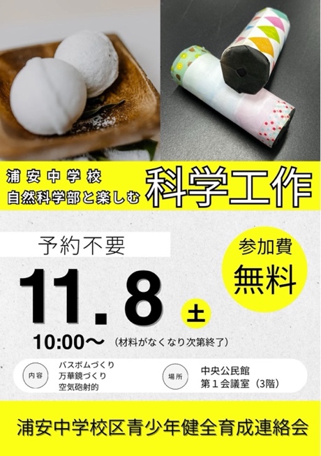 あったか〜いお風呂の恋しい季節! 手づくりの入浴剤で楽しみながらカラダぽかぽか♬ 浦中自然科学部とバスボム&万華鏡づくり、空気泡の射的も楽しんだ! 中央公民館地域交流会