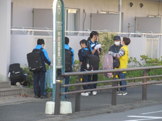 中1の生徒に同行した地域の方が「最初の方こそ、遠足気分だなーなんて思っていましたが、徐々にゴミ拾いに集中し、真剣に取り組んでくれていたのが嬉しかった」と話してくださいました。