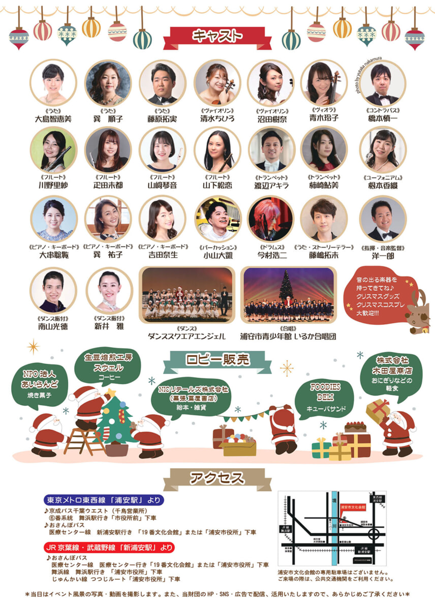 地元浦安のダンススタジオ「ダンススクエア」のメンバーで構成された「ダンススクエアエンジェル」や浦安市青少年館主宰の児童合唱団「いるか合唱団」の皆さんと、有名なクラシック音楽とクリスマスメドレーを披露します。他にも、観客参加型コーナーもあり、各自持参した音の出る楽器を使って一緒にコンサートを盛り上げることもできるんだとか。