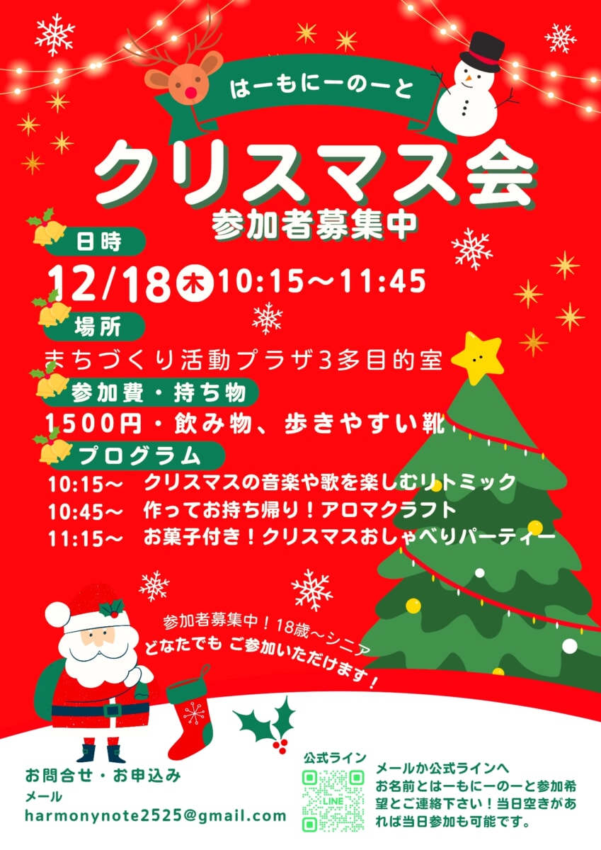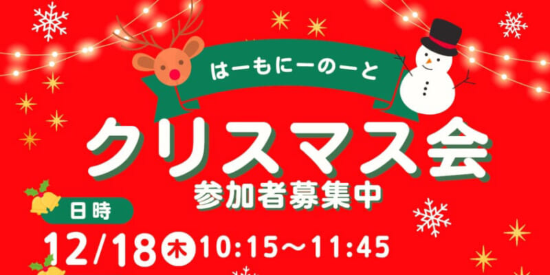 はーもにーのーとのクリスマス会 参加者募集中! 対象は、18歳以上〜大人の皆様。活動時間は月に1回、木曜日10時15分~11時45分です。
