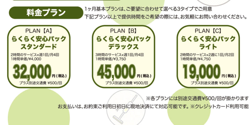 そして現在、オープニングキャンペーンとして、期間限定お試しサービスを実施中です。「PLAN C」のらくらく安心パックライトの、2時間のサービス(月2回)を特別特価の12,000円で1回利用(交通費込み)できます。