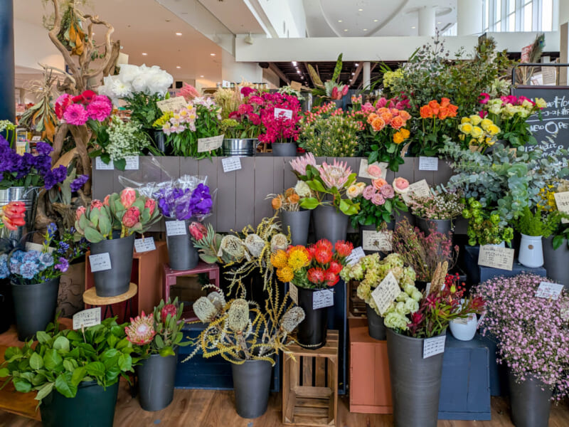 ニューコースト新浦安の海側の入り口を入ってすぐ、色も形も見慣れないのに、どこか温かくて力強い――そんな不思議な魅力のお花たちが並ぶお店があります。