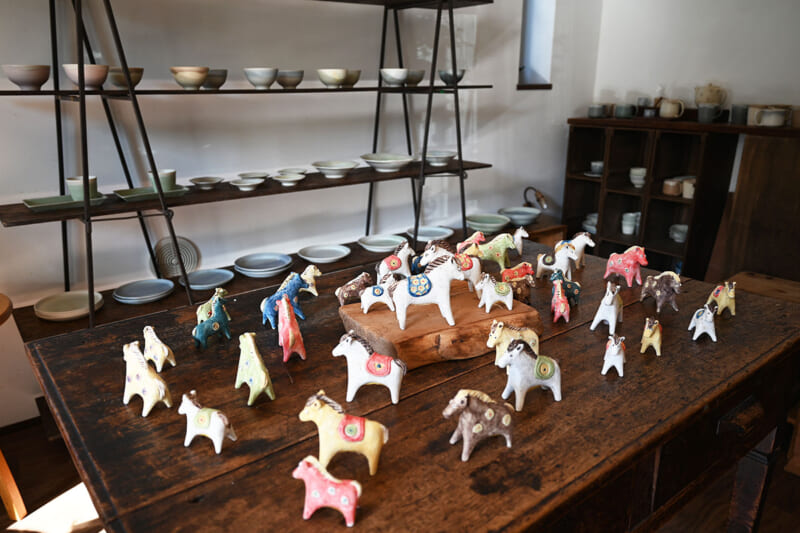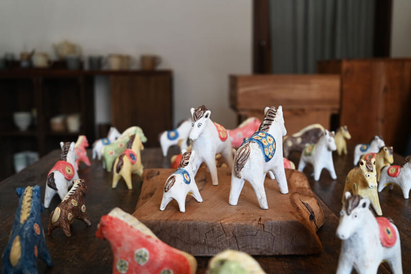 そんなすなおさんの作品でひときわ注目を集めているのが、来年の干支「馬」の置物。すなおさんは毎年この時期の展示会に合わせ、干支の置物を制作することを恒例としており、「干支はずっと昔から必ず作っています。毎年、かなりの時間をかけていますね」と話します。中には、干支シリーズを“二周目”で集めている方もいるほど。2001年頃、どんぐりさんで展示を始めた当初から続く干支シリーズは、すなおさんの代表作のひとつで、多くのファンが器の新作とともに楽しみにしています。また、市内のお店の方々の来店も多く、店先にこの干支の置物を飾るお店が多いのも印象的!