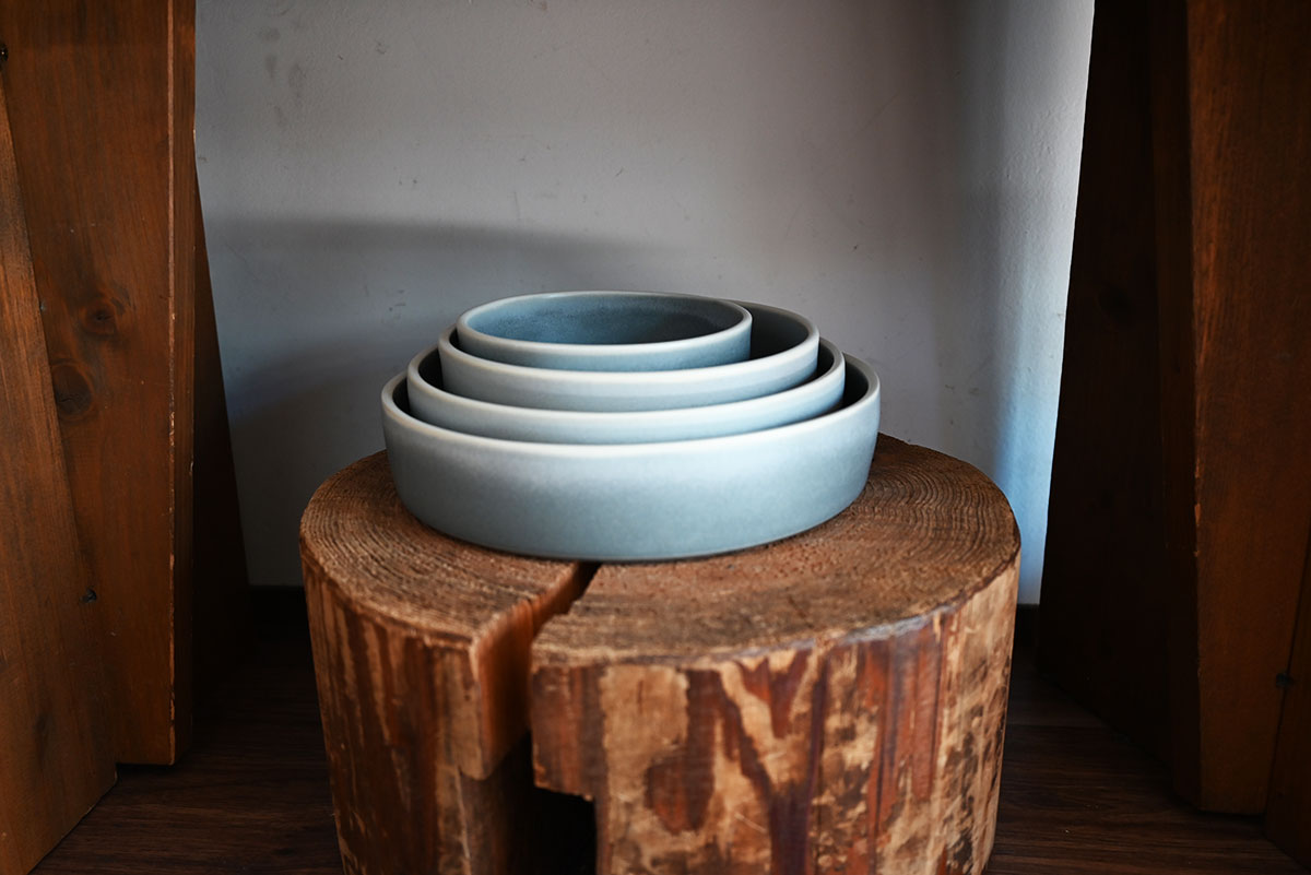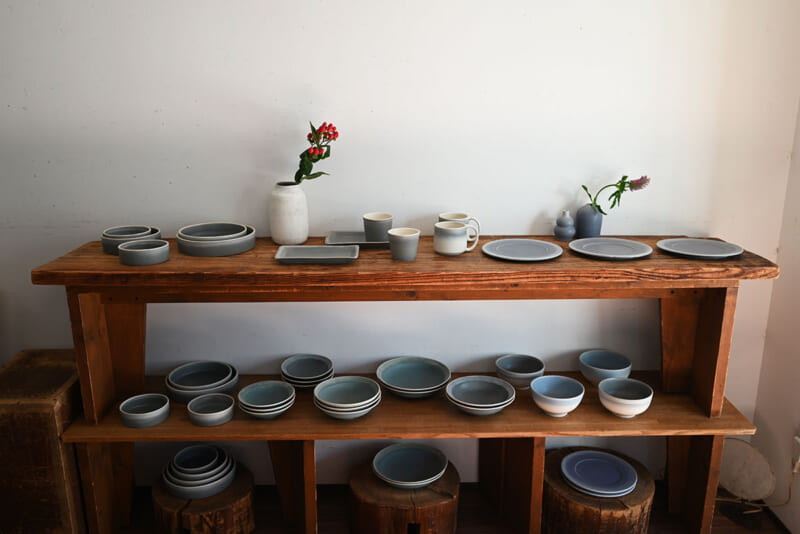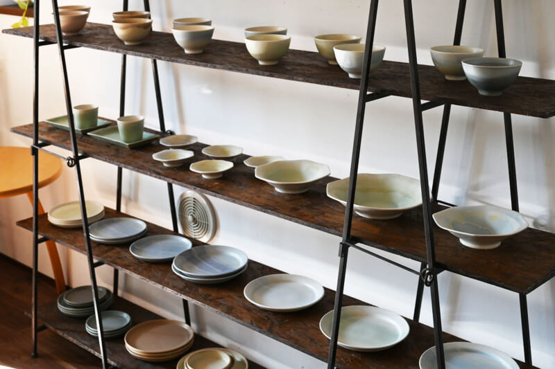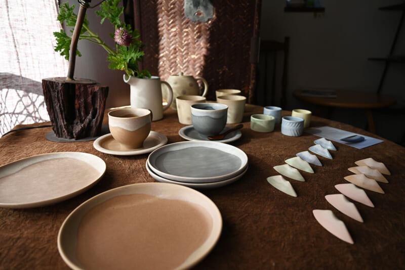 また、今回の器では、どら鉢、八角皿、平皿、新しい釉薬を使った器など素敵な新作が並びます。すなおさんの作品を特徴づけるのが、独特で奥行きのある色合い。市販の釉薬に頼るだけでなく、自ら調合し、焼く温度も細かく調整しています。釉薬の掛け方ひとつで表情は大きく変わり、厚くかけすぎると割れてしまうことも。「最後の焼きは自分の手を離れてしまうので、焼き上がるまでどんな色になるかわからない、陶芸ならではの難しさであり、面白さでもあるんです」と、すなおさんは話します。