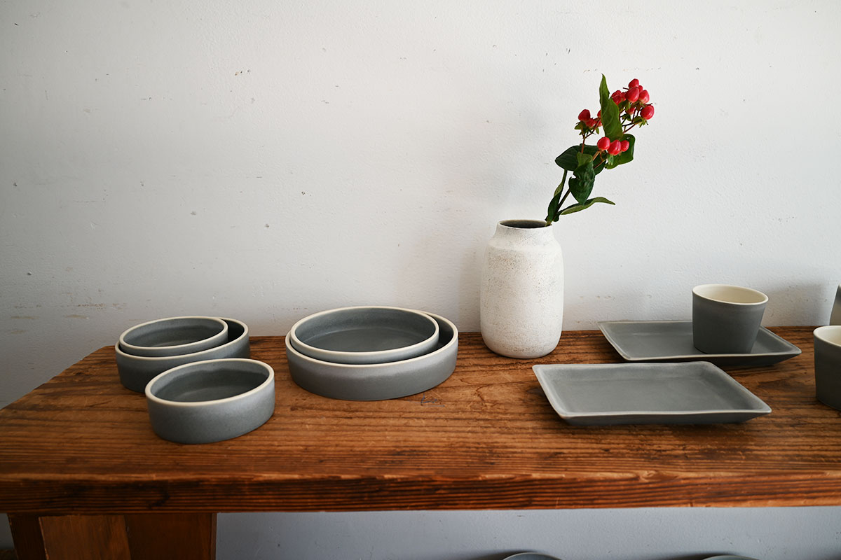 どの展示会でも“初お披露目”の作品を必ず用意するのが、すなおさんのモットー。今回の新作では、丸みのある“どら鉢”のグレーの器は、これまで使用してきた窯の温度をわずかに上げて焼くことで、より深みのある色を引き出すことができるのだそう。可愛らしいフォルムに、濃いグレーの中にほんのり紫を感じる柔らかな色合いは、まさにすなおさんならでは。どんな料理をのせようか、スイーツなのか、楽しみが広がります!