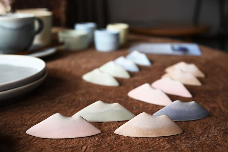 店頭には、そんな「北条 川田家住宅」の国指定登録有形文化財を記念して制作された作品も並んでいました。すなおさんが手に取ったのは、筑波山をかたどった愛らしい箸置きでした。「記念に何か作ろうと思って」と生まれたこの作品は、春夏秋冬を色で表現しています。ピンクは春、緑は夏、オレンジは秋、そして紫は冬。紫色は、筑波山の別名「紫峰(しほう)」に由来しているのだそうです。しかもこの箸置きには、男体山と女体山という二つの峰もしっかり再現されています。「こっちから見ると、右側が少し高いんです」と、土地をよく知るすなおさんならではの視点が添えられ、作品に込められた想いとすなおさんイメージの色合いがとってもかわいかったです!