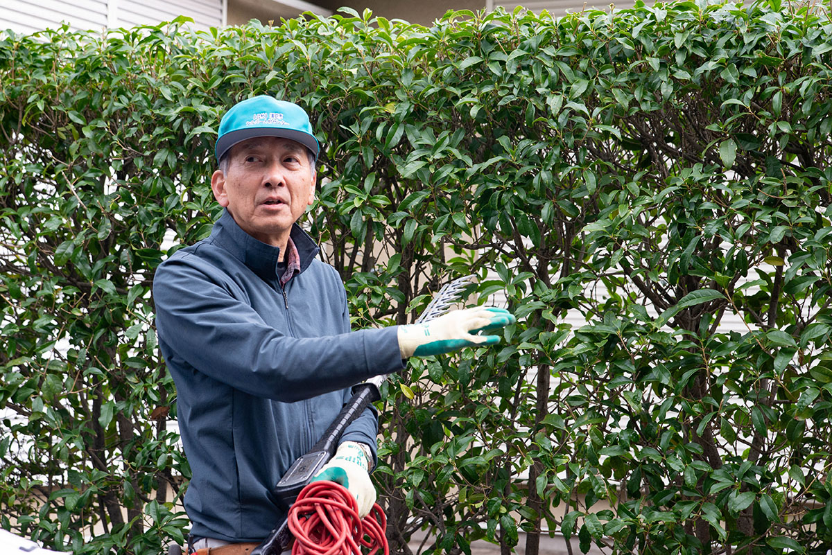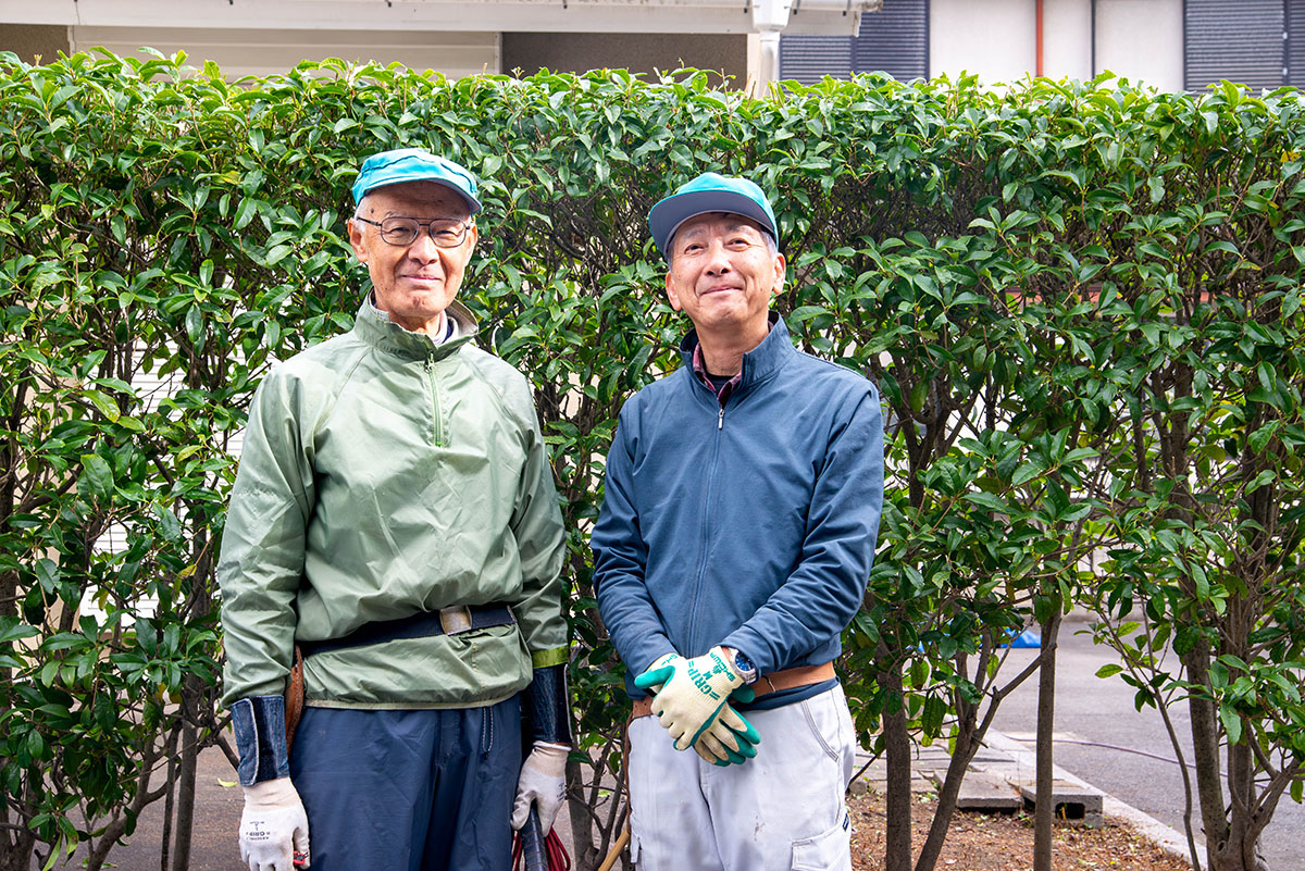 この日、市内自治会館の剪定作業を行っていたのは、奥山さん(75歳)と山中さん(69歳)。山中さんは今年4月に正式採用されたばかりで、剪定作業は未経験でしたが、約20日間の研修でしっかり基礎を身につけたそう。「体力づくりや認知症予防にもなるし、新しい刺激がほしくて挑戦しました。先輩方が丁寧に教えてくださるので、ありがたいですね」と笑顔で話します。一方、奥山さんはこの道10年のベテランさん! 木ばさみの音に魅力を感じ、知人宅の庭木手入れをお手伝いしたことが、剪定との出会いだったとか。「好きなことを出来るのが、一番ですね」と穏やかに話します。