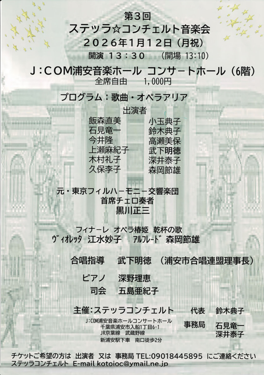 令和8年の幕開け!1月12日(月・祝)J:COM浦安音楽ホールで開催される、チェロの調べとオペラ歌唱の華やかな饗宴(演奏曲紹介あり)