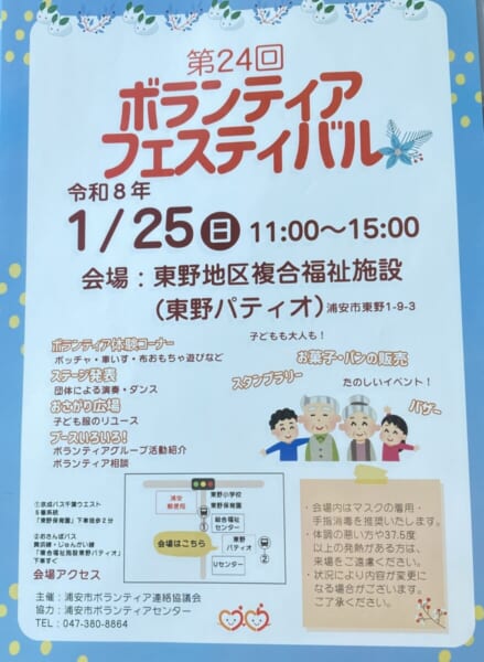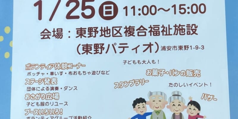 | 詳細など | 主催 浦安市ボランティア連絡協議会 協力 浦安市ボランティアセンター 問い合わせ 047-380-8864 |