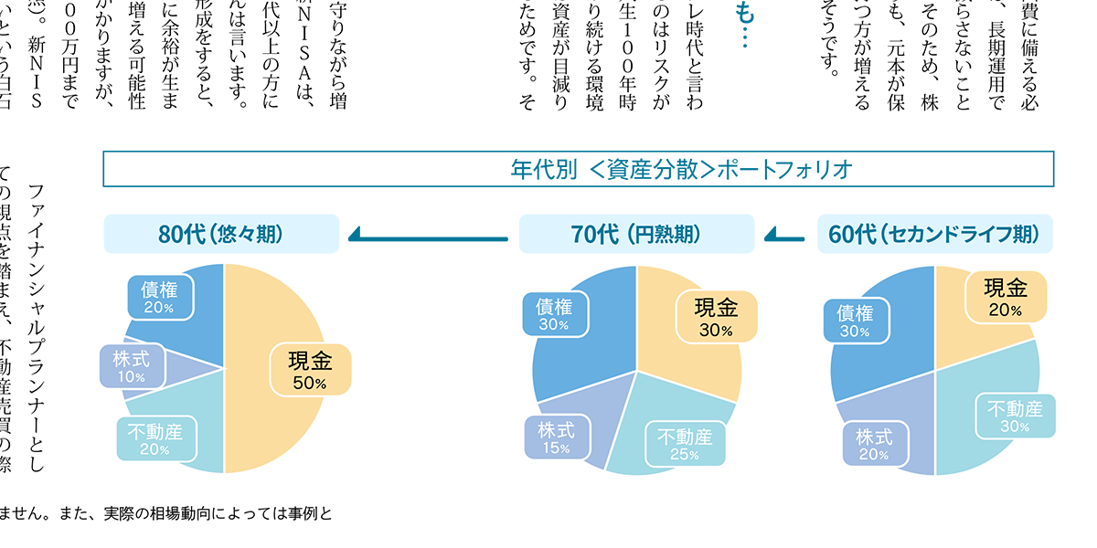 資産には現金、株式、不動産、コモディティ(貴金属など)とさまざまな種類があり、それぞれ役割が違います。白石さんも「これからの時代、資産を分散して持つことはとても重要」と話します。今回、60代・70代・80代それぞれの理想的な資産割合を示す円グラフを作成しました(下図)。ぜひ、ご自身の資産と照らし合わせてみてください。割合の特徴的な点は「60歳以上になると現金の割合が大きく増える」という点。理由は大きく2つ。1つ目は、収入源が年金中心になるため、医療費・介護費など急な出費に備える必要があること。2つ目は、長期運用ではなく、今ある資産を減らさないことが優先されるためです。そのため、株式などのリスク資産よりも、元本が保証される現金を多めに持つ方が増えるのは、自然な流れなのだそうです。