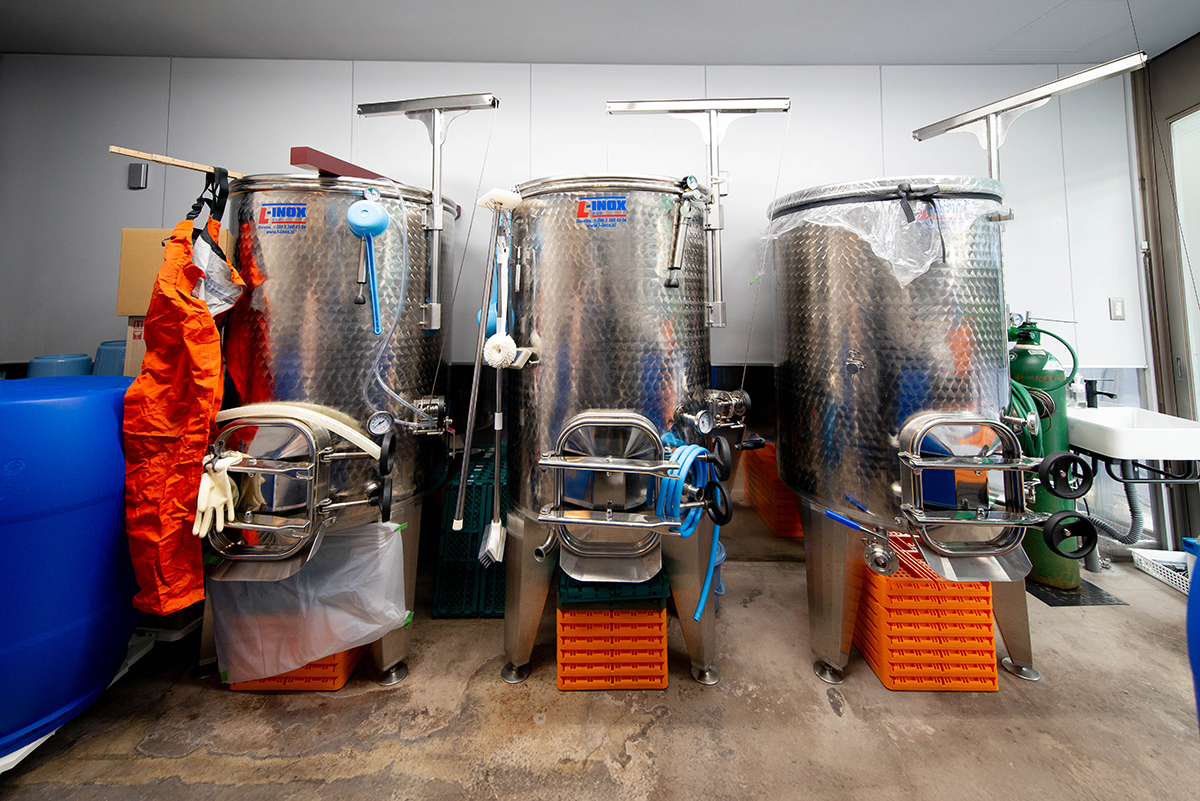 さらに昨年夏にはクラウドファンディングの一部支援をもとに、 600Lタンク3基や油圧式プレスなどの機材が搬入され、いま浦安で醸造する初のワインが仕込まれています。