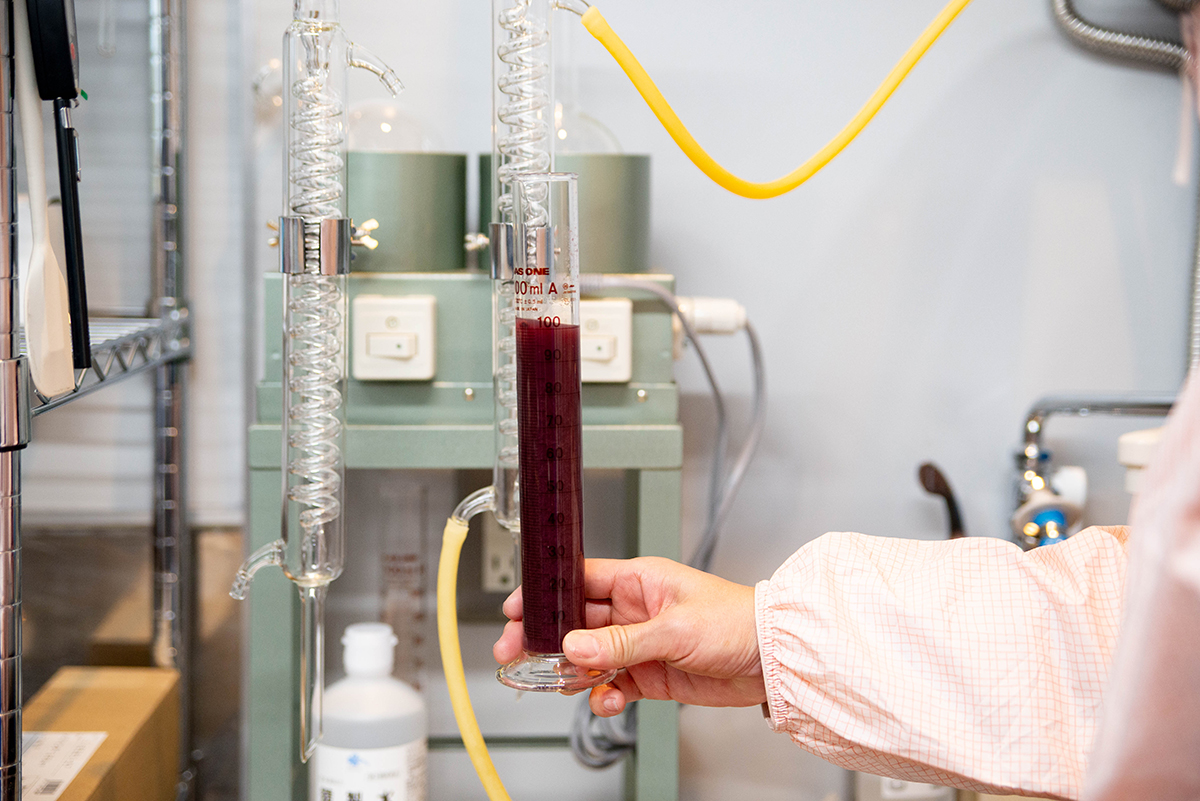 工夫しながら醸造に向き合います。比重計を使用し果汁を計測、まさに実験のような器材を用いて醸造に励んでいます。
