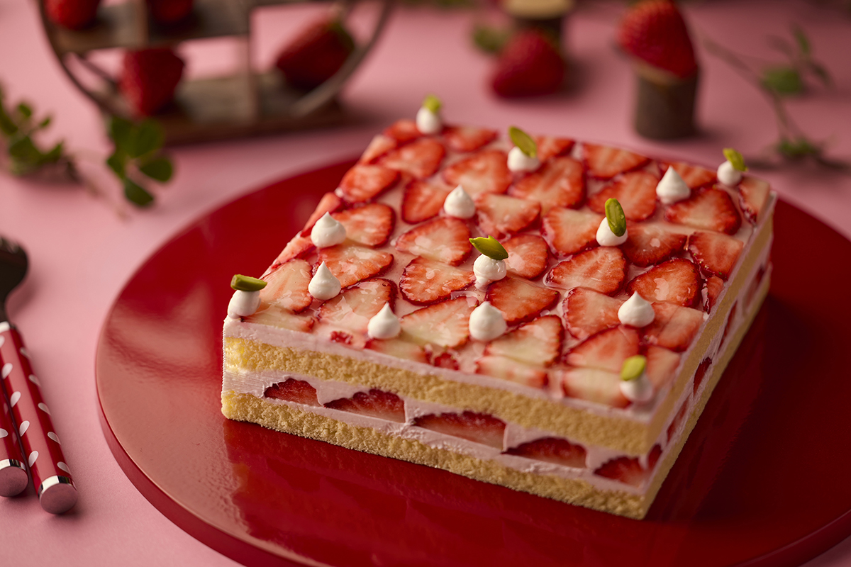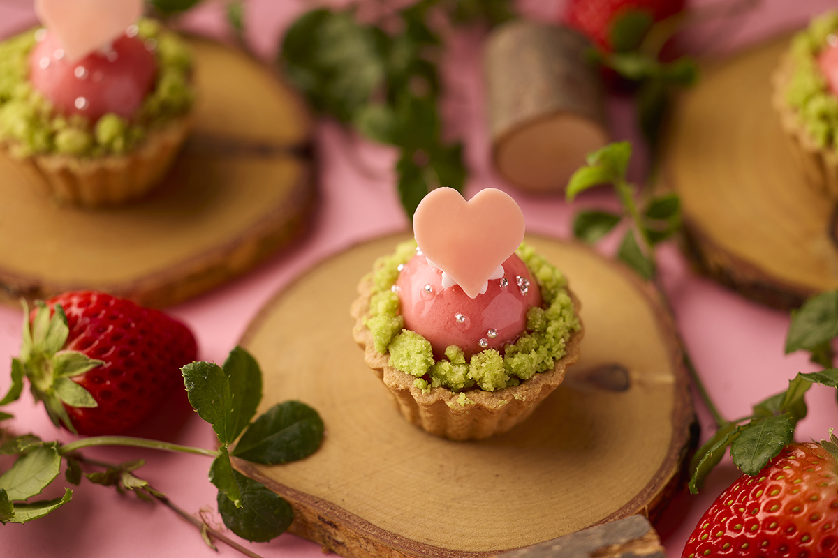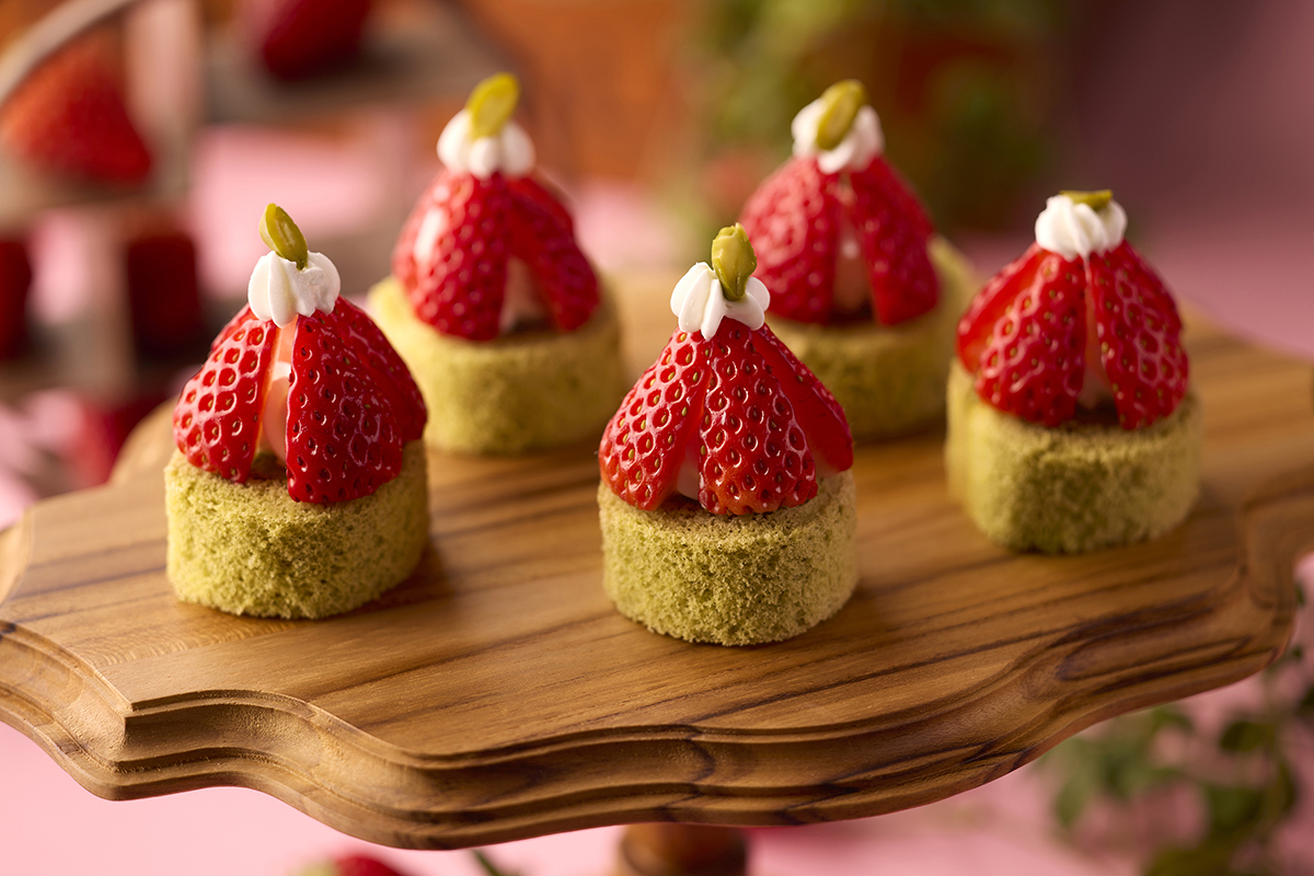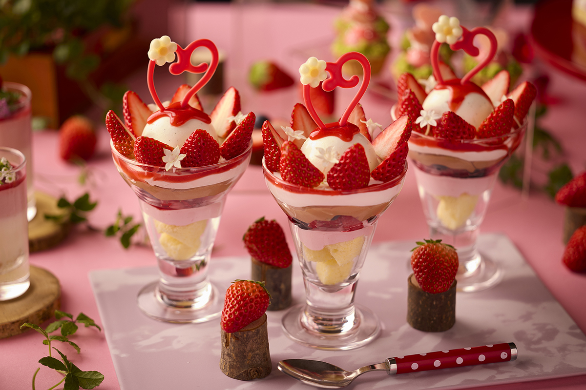 パティシエによる実演コーナーで提供される苺たっぷりの「ストロベリーチョコレートパフェ」をはじめ、花のつぼみを思わせる「抹茶ロールとストロベリー」、苺のスライスで可憐な花びらを表現した「チョコレートタルトフレーズ」、花咲く庭園をイメージした「ストロベリードームケーキ」「ストロベリーショートケーキ」など、苺を思う存分味わえるのはもちろんのこと、シェフの遊び心たっぷりにデコレーションされた乙女心をくすぐる約25種類のストロベリースイーツを贅沢に堪能できます。