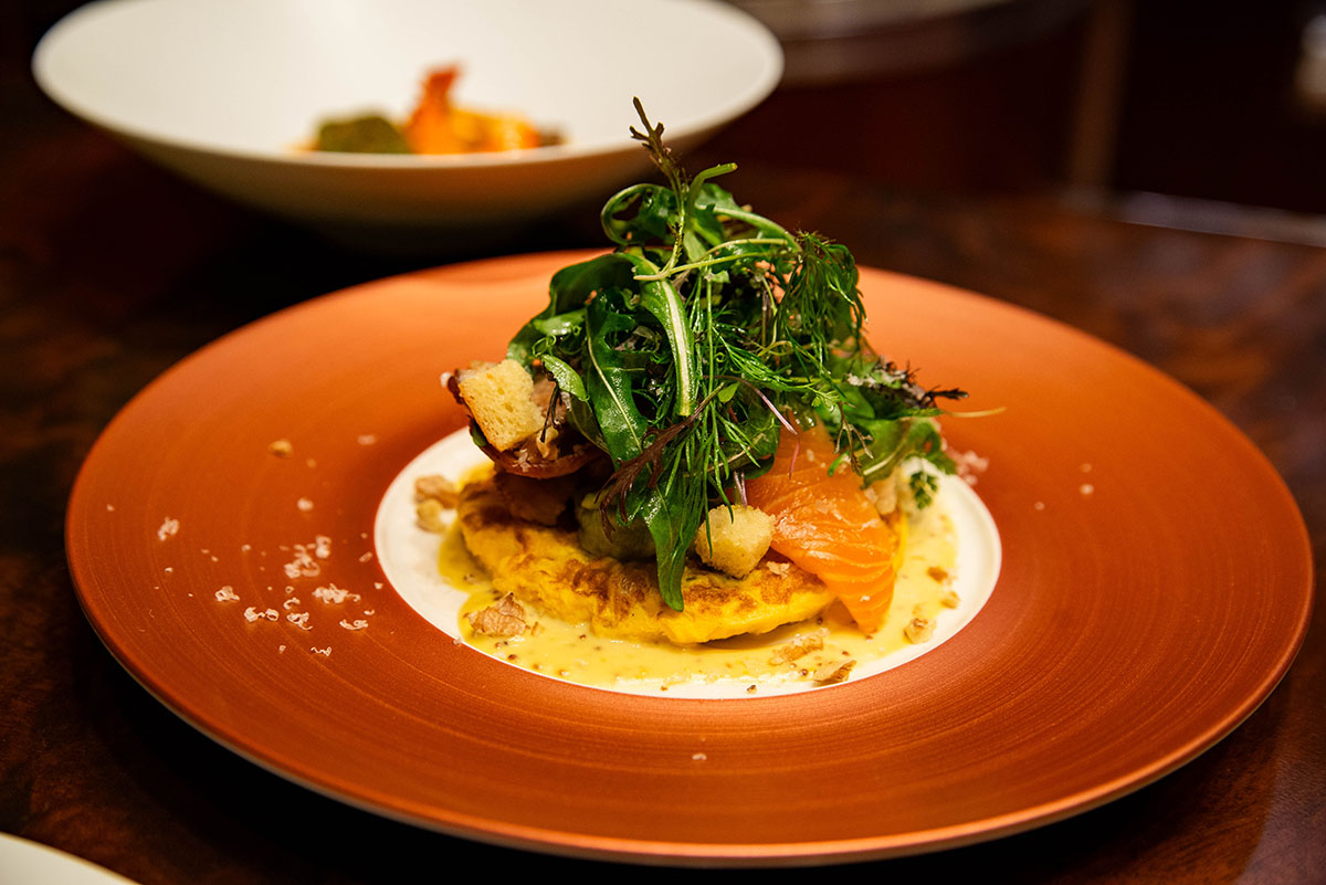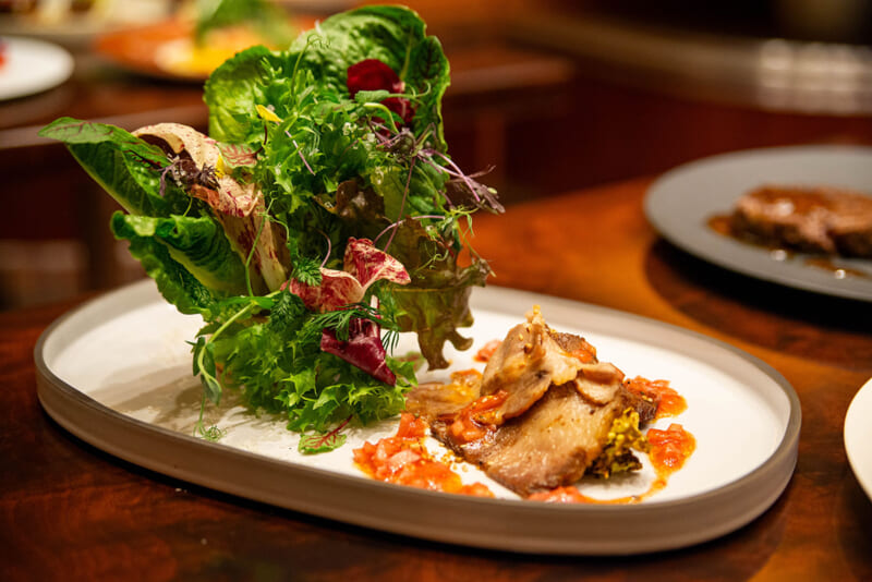 こちらのコース料理でひと際目をひくのは、前菜の一品「エンパイア・グリル特製 国産牛のブリスケットとライトスモークベーコンのシーザーサラダ」