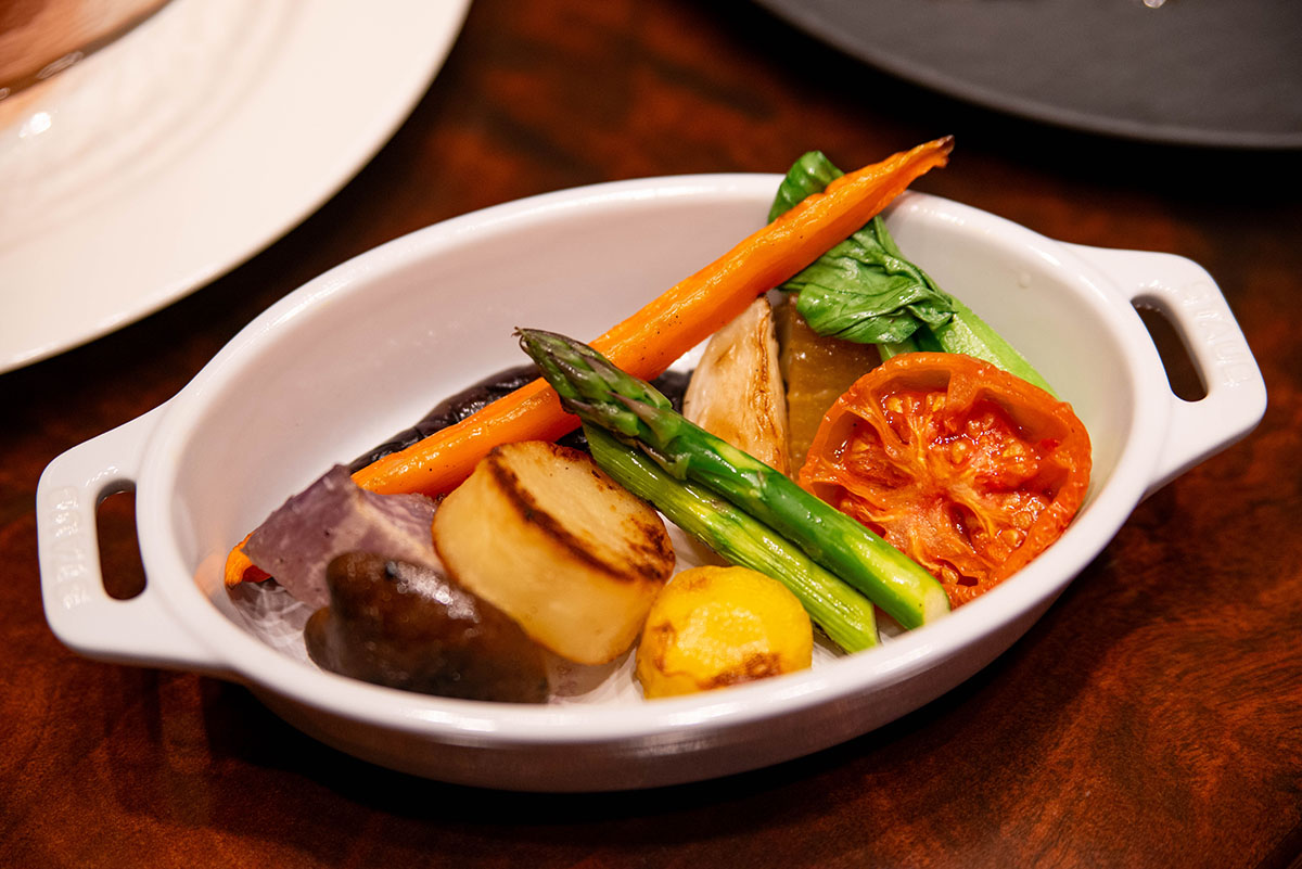 まるで野菜のブーケをそのままお皿に盛りつけたよう!美しい前菜ですよね。じっくり4時間かけて焼き上げた国産牛のブリスケットと燻製香る自家製ベーコンが、みずみずしい野菜との相性抜群!ひと口ごとに満足感が広がります。