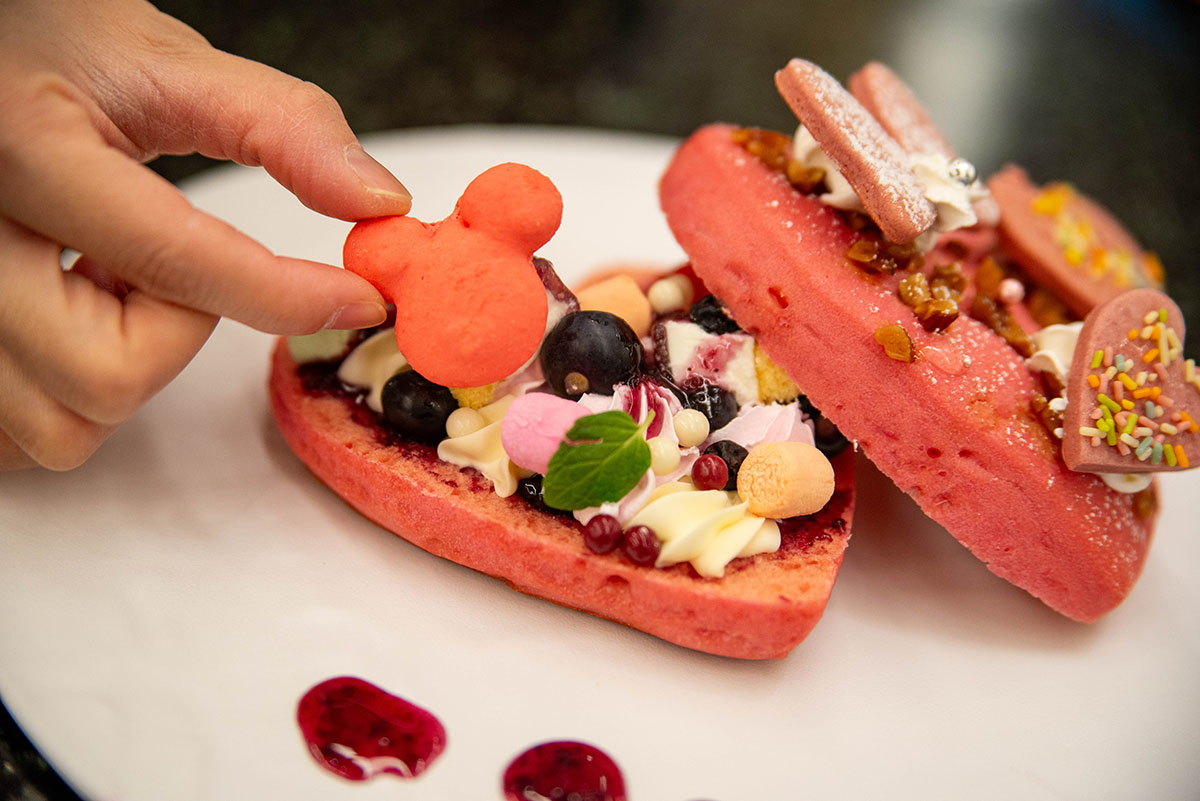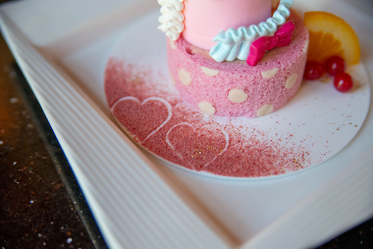 華やかな色合いのフルーツやハート型のゼリーで、ミニーマウスのキュートな可愛らしさを表現。ルビーチョコレートムースの上に、ホワイトチョコレートで作ったふわふわのエスプーマを添えて――様々なチョコレートの味と食感を楽しめる一品です。