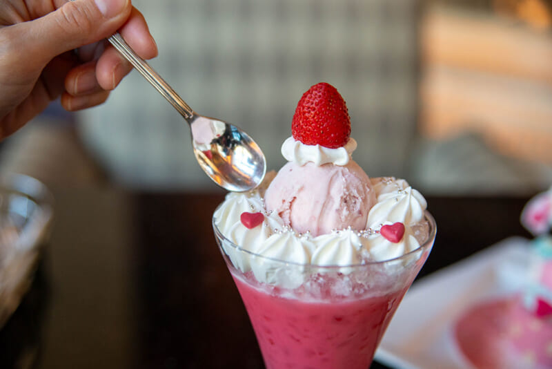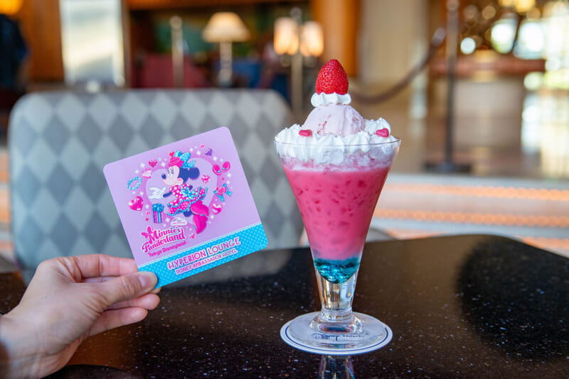 スペシャルドリンクもかわいい!水色と淡いピンクのグラデーションに、ハートやいちごがあしらわれ、ミニーマウスのラブリーな世界観が表現されています。ブルーシロップの中には、大きめのアラザンが入っていて、ドット柄を思わせる遊び心もかわいい♡