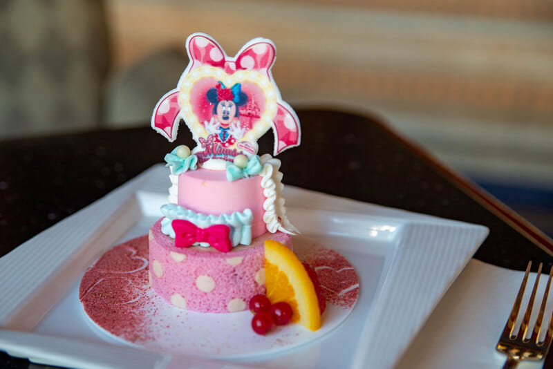 もう!かわいい!!ミニーマウスらしいドット柄に、淡いブルーとピンクで統一されたかわいすぎるケーキがテーブルに運ばれてきました。