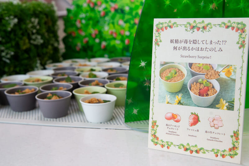 また、妖精が育てる鉢植えをモチーフにした、なめらかな食感の「フェアリーガーデン チョコレートパンナコッタ」はザクザクとしたクッキーをスプーンで掘ると、妖精が隠したフレッシュ苺、苺のアーモンドチョコレート、苺の生チョコレートのいずれかがチョコレートパンナコッタとともに現れます。どれが出てくるかは運次第。妖精と遊んでいるような、ワクワクしてしまうスイーツでした!